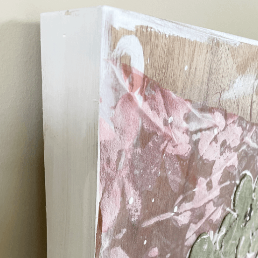 Original mixed-media artwork featuring delicate sage-green florals on a textured wood panel. Hand-painted blooms with soft white detailing rest against a layered background of pink and natural wood grain. Artist-signed.