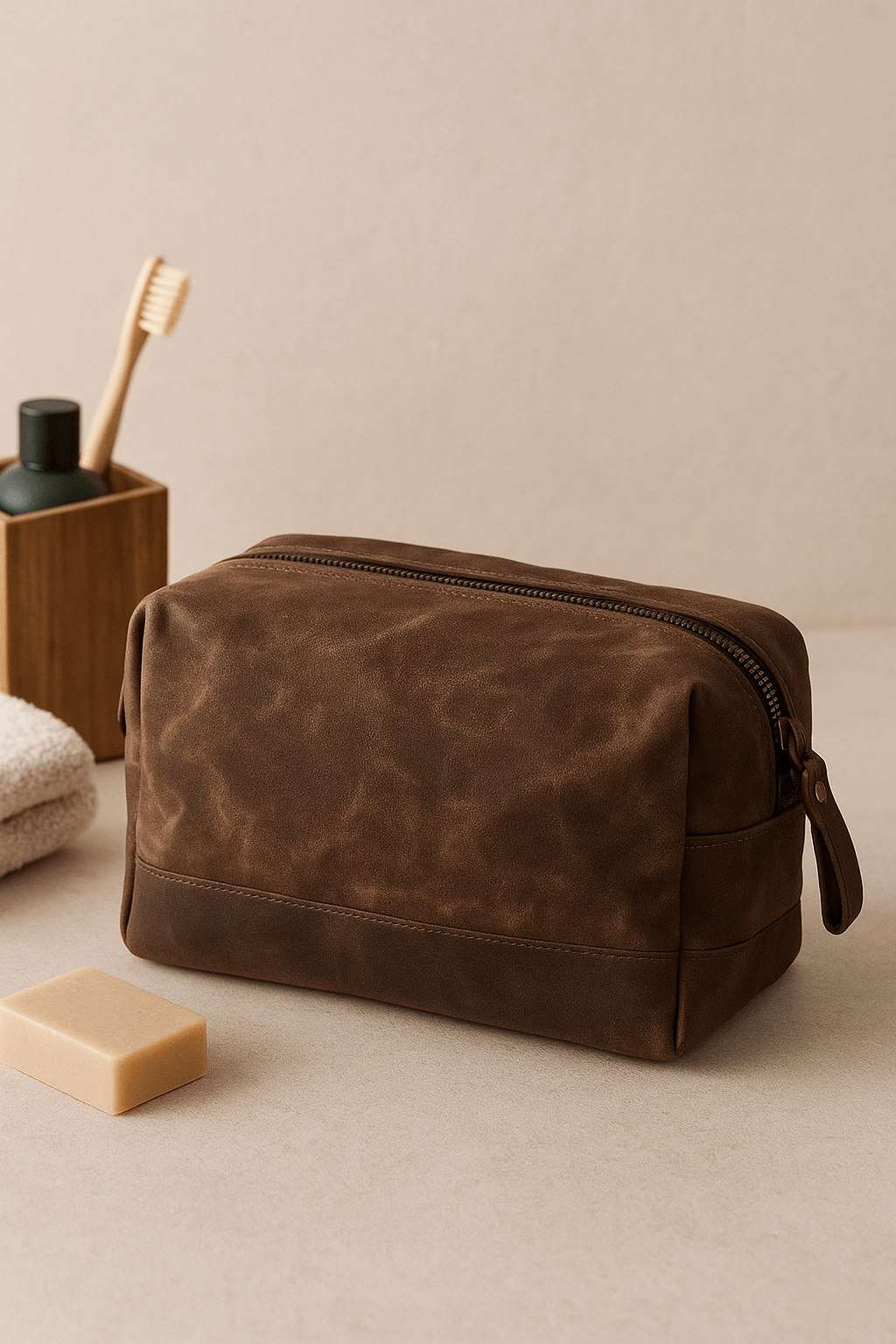 Get ready to travel in style with our spacious and durable Khaki Canvas Dopp Kit. Crafted from waxed canvas that develops character with use, this kit features antique brass snaps, a striped interior, water-resistant lining and finished with rich brown or slate accent. Pack smart, pack stylishly. (Contact the store for information on monogramming for a personalixed touch)